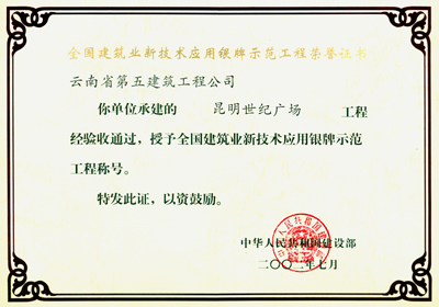 世紀廣場銀牌示范工程證書